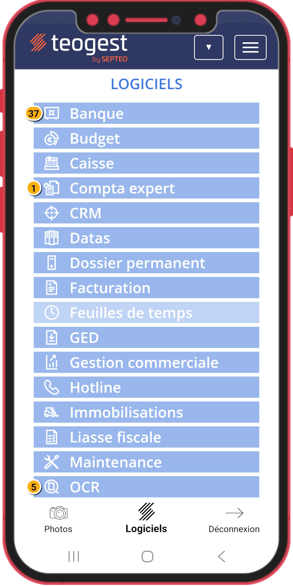 Notre application mobile a une double vocation : d'une part, vous permettre de vous connecter facilement à vos logiciels sans avoir à saisir vos identifiants à chaque connexion et, d'autre part, de prendre des photos de notes de frais ou de factures et de les envoyer (de manière unitaire ou groupée) dans le module Teogest OCR pour les intégrer à la comptabilité.